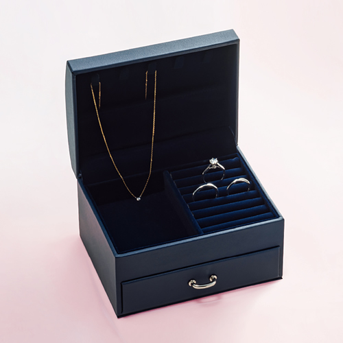 ジュエリーが美しく映え、大切に守る上質な作りのジュエリーボックスをご用意しています。ネックレスをかけるフックや引き出し付きで収納力抜群。ネイビーのレザー調ボックスにゴールドの金具がついたシックな印象でどんなインテリアにも馴染みます。