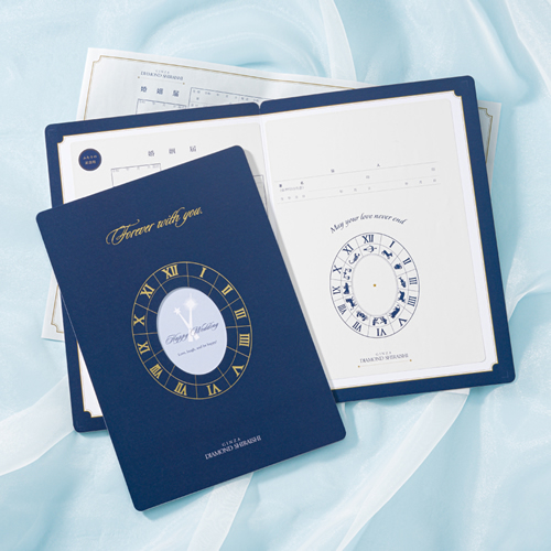 銀座本店のシンボルである時計をモチーフにした婚姻届。提出用と保管用をご用意しています。保管用は写真を貼ることも可能です。また、内側には星座がちりばめられた時計のイラストが描かれており、上にリングを置いて写真を撮影することもできます。おふたりがご夫婦になられる特別なアイテムが、素敵な思い出となるようにご用意いたしております。