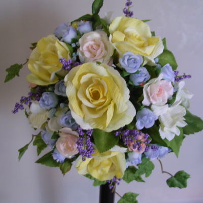 バラ ラウンドブーケ 爽やかなイエローに、淡いブルーピンクの小花。パステルのドレスに