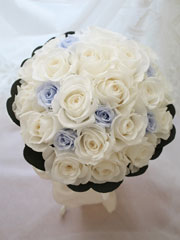 シンプルなラウンドブーケ。ピュアホワイトと少しサムシングブルーのバラを入れています。リーフはユーカリを使用。