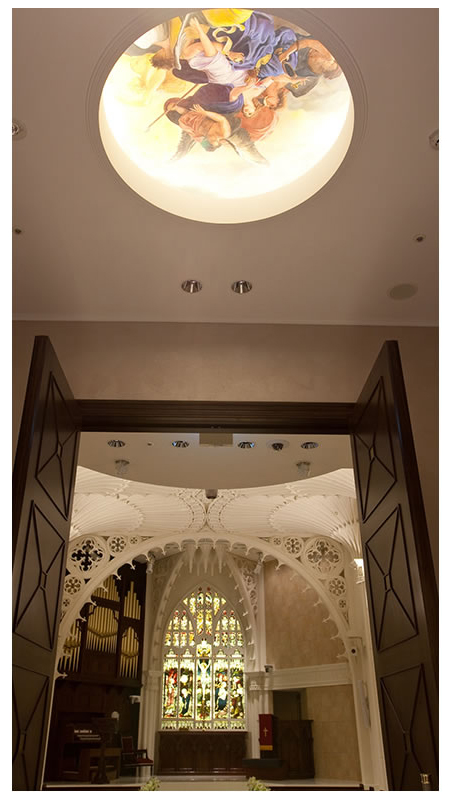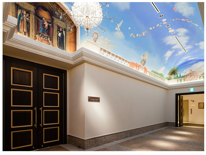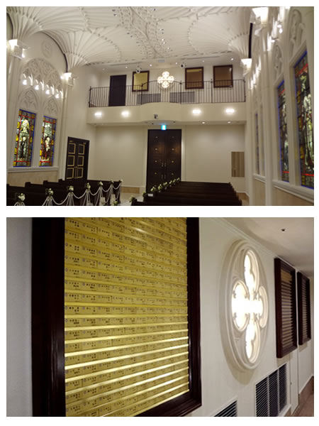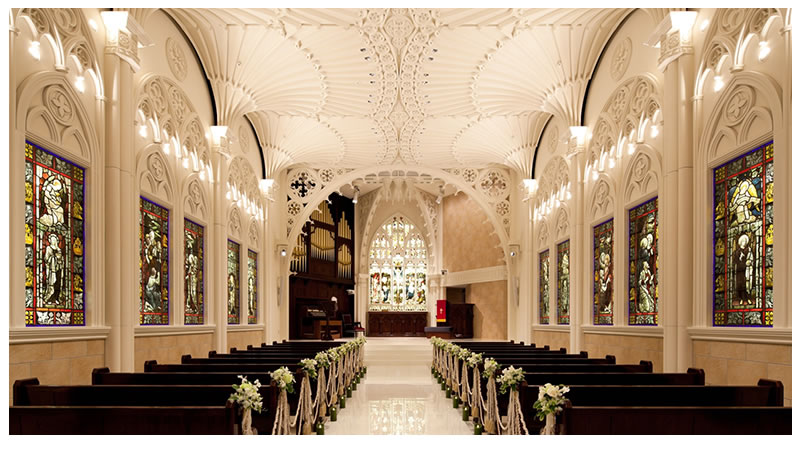 壮大なスケールが自慢のセントジョージ・チャペル。大聖堂をぐるりと囲むのは、ロビンフッドが結婚式を挙げたといわれるイングランドの教会から譲り受けた格式高いステンドグラス。繊細な装飾から降り注ぐ光に包まれて、両親との思い出を胸に新たな一歩を踏み出して。