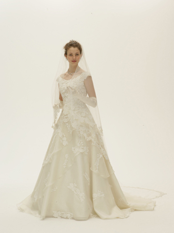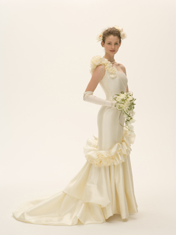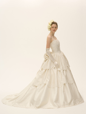 ウエストから広がるドレープは張りのあるミカドシルク。フリルとリボンの組合せがプリンセスラインの愛らしさを引き立たせる。