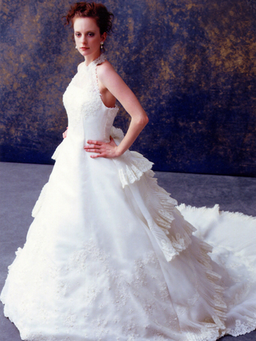 スカートのテールに付いたレースが可愛いロングトレーンのウエディングドレス。