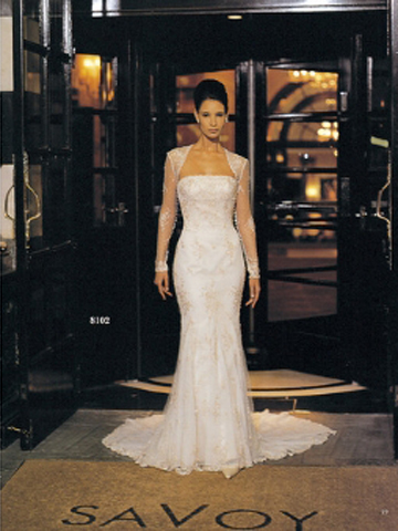 レースのボレロが取り外し可能なビスチェのスレンダードレス。イタリアのレースを使用し、ビージングを施しています。