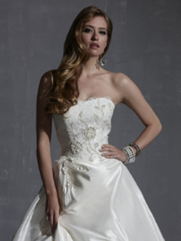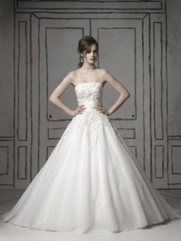 ビージングを施したロングトレーンが美しい、 Aラインドレス。