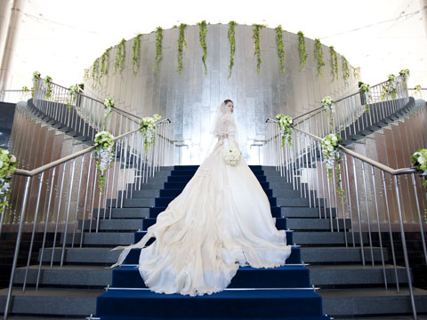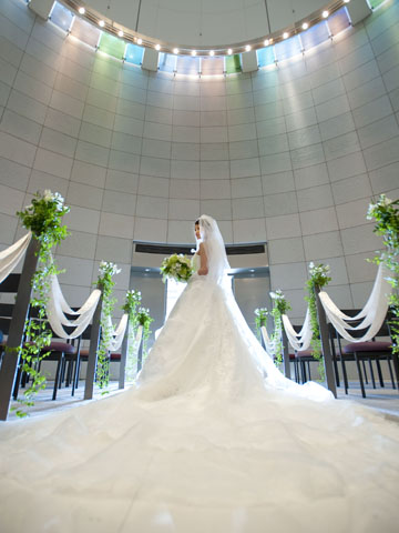 挙式は独立型チャペル・アトリウムチャペル・富岡八幡が執り行う神殿の中から選択可能。ドーム状になった石造りの独立型チャペル「ルミエール」は、8メートルの天井から注ぐ光の演出が特徴。アトリウムチャペル「グランデュール」は吹き抜けになっており、自然光が優しく降り注ぎます。サファイアブルーのバージンロードは花嫁のウエディングドレスをより一層美しく見せてくれます。