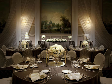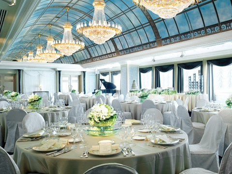 舞踏会を思わせる格調高いパーティー会場。フランス庭園をモチーフにした壁画と豪奢なシャンデリアが優雅な天井高8mのゆったりとした空間を演出。