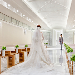 ドレス姿がより映えるゆったりとした純白のバージンロード。チェロとオルガンが奏でる音楽。挙式の感動がよりいっそう深まるチャペル。