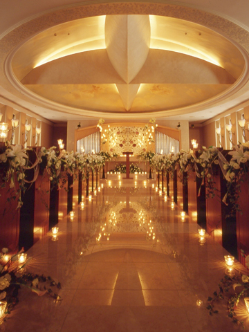 金の十字架とフレスコ画の天使をイメージした天井。大理石のバージンロードは18M
