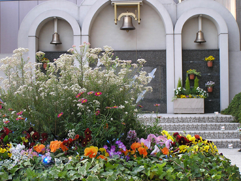 チャペルに隣接するカリオンガーデンにて、ゲストからフラワーシャワーの祝福を